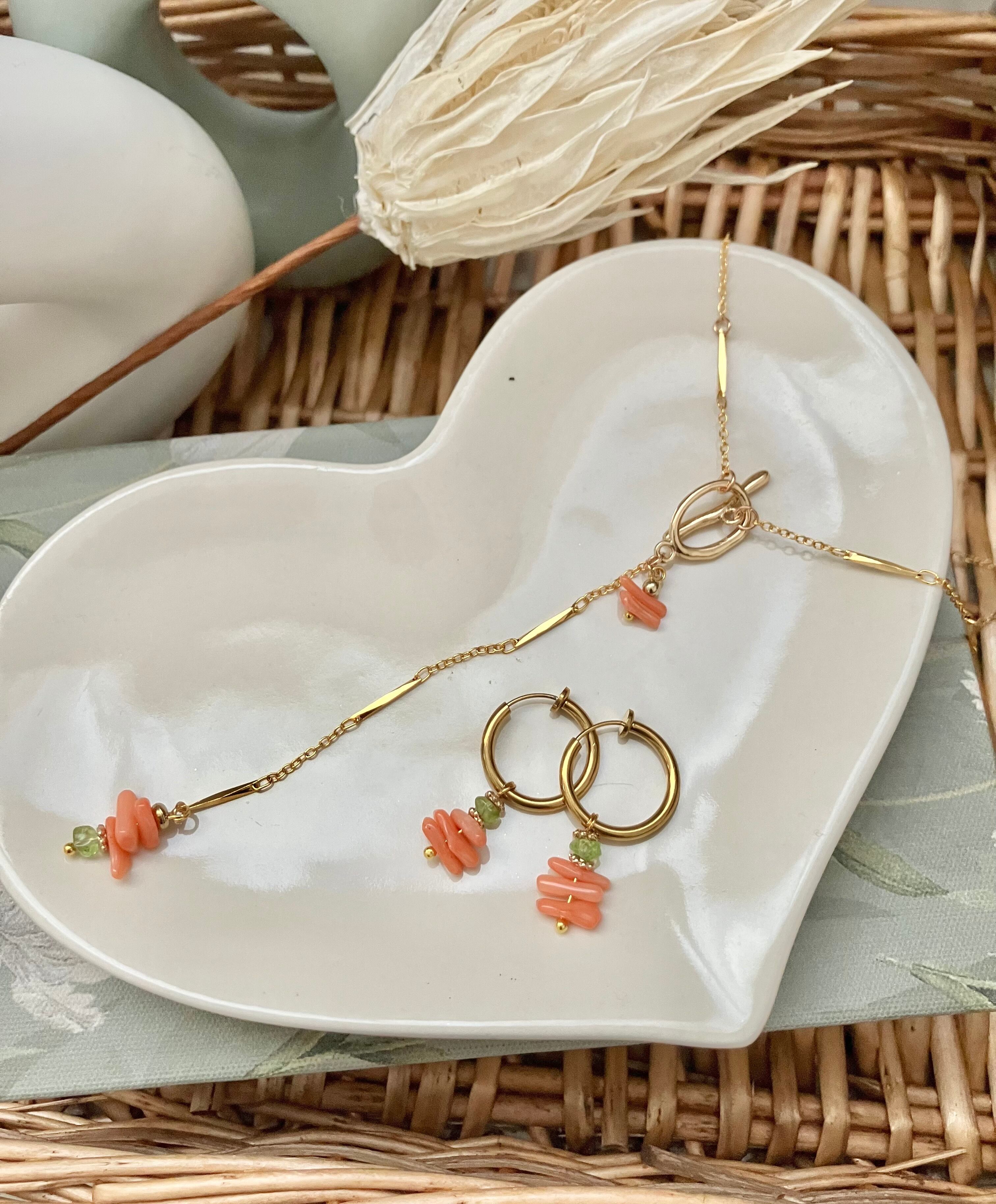 淡い色合いの染めサンゴと煌めくペリドットが融合した華やかなY字ネックレス。